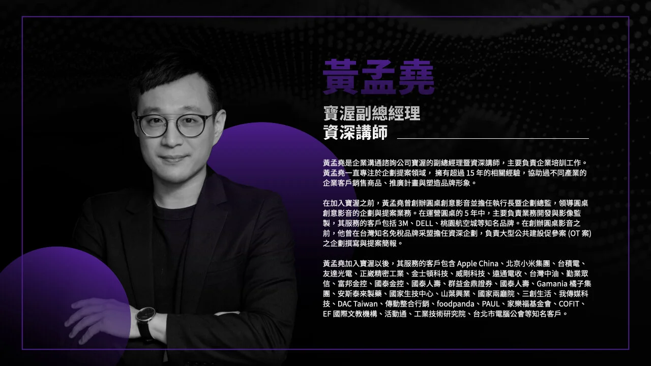 黃孟堯是企業溝通諮詢公司寶渥的副總經理暨資深講師,主要負責企業培訓工作。黃孟堯一直專注於企劃提案領域, 擁有超過 15 年的相關經驗,協助過不同產業的企業客⼾銷售商品、推廣計畫與塑造品牌形象。