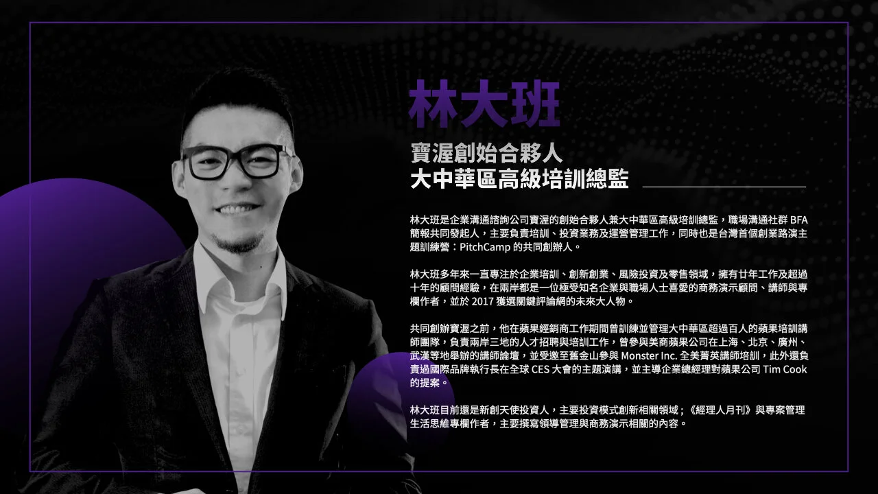 林大班是企業溝通諮詢公司寶渥的創始合夥人兼大中華區高級培訓總監,職場溝通社群 BFA 簡報共同發起人,主要負責培訓、投資業務及運營管理工作,同時也是台灣首個創業路演主題訓練營:PitchCamp 的共同創辦人。