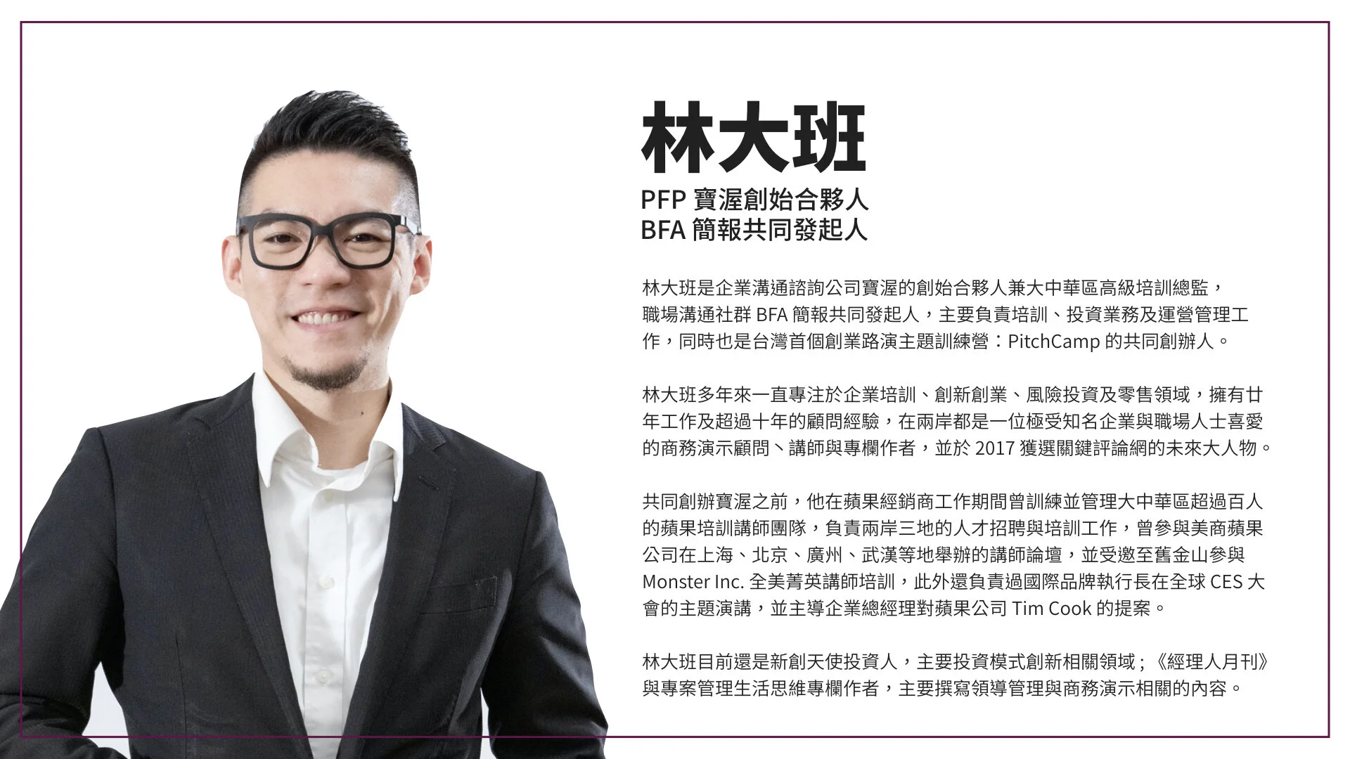 林大班是企業溝通諮詢公司寶渥的創始合夥人兼大中華區高級培訓總監,職場溝通社群 BFA 簡報共同發起人,主要負責培訓、投資業務及運營管理工作,同時也是台灣首個創業路演主題訓練營:PitchCamp 的共同創辦人。