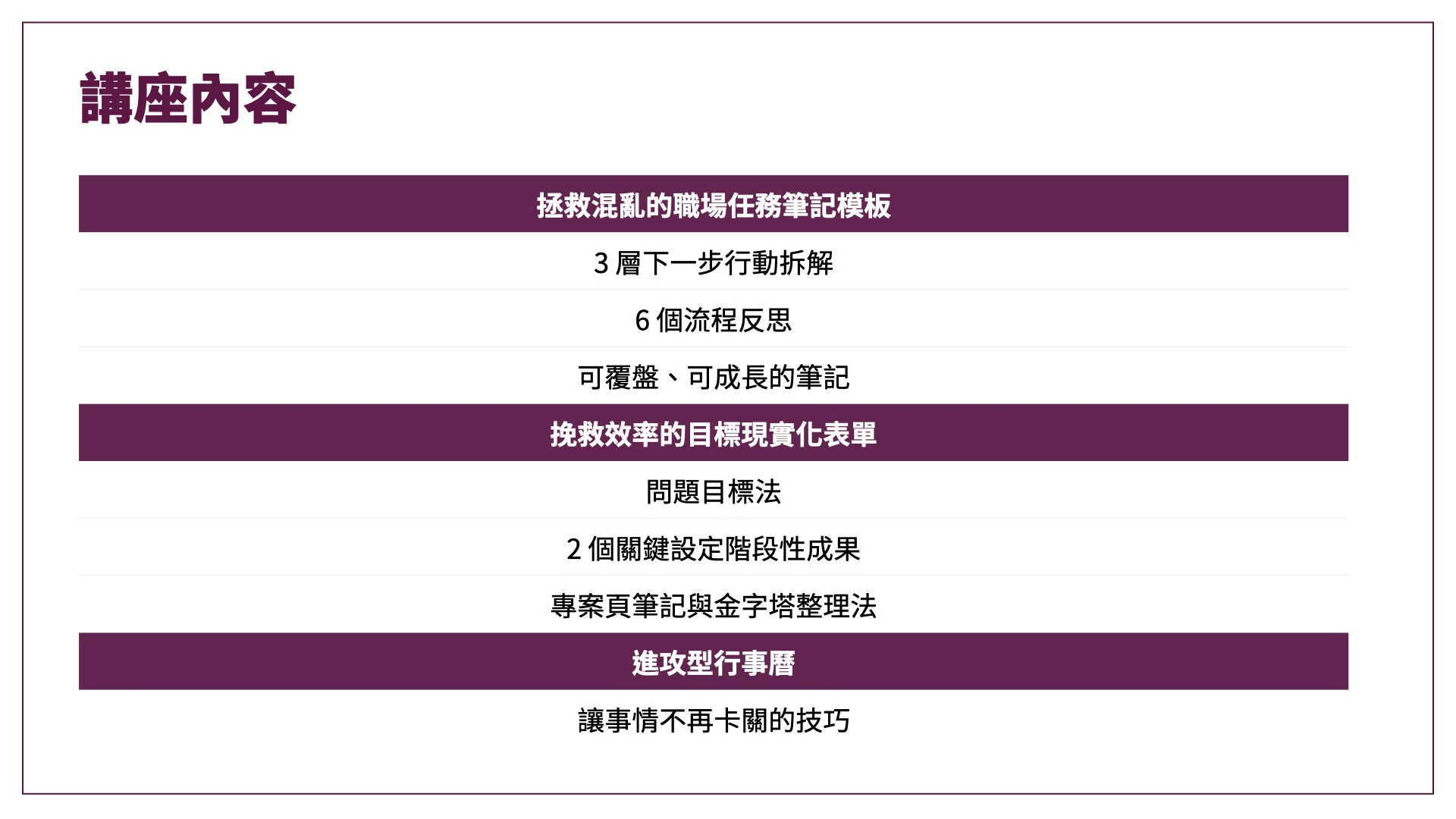 許多工作者會被任務追著跑,或是明明工作內容都差不多,卻無法提升效率。面對上述情境,我們需要的可能不僅僅是時間管理方法,而是一套可被執行的「職場筆記模組」,能有效的幫助我們把一件一件的工作任務推進、完成,並且節省更多時間,進而達到工作中的正向循環。