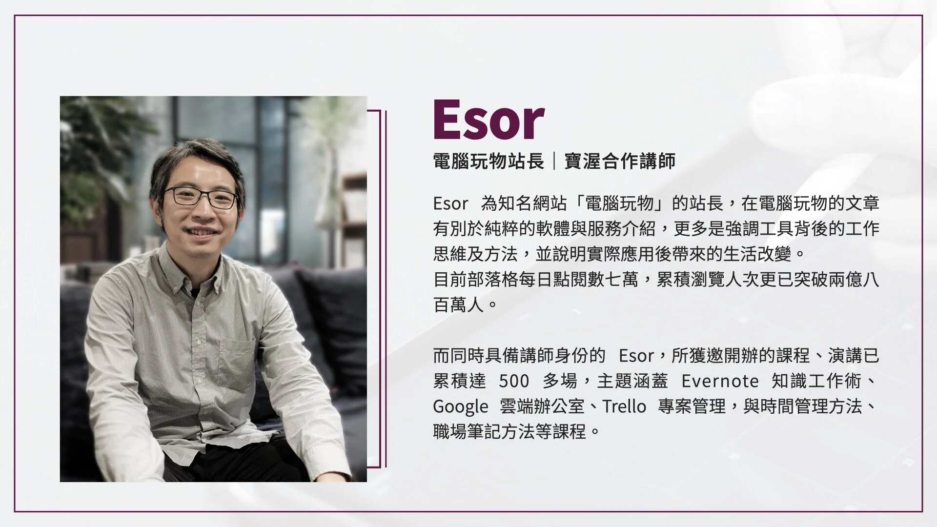 而同時具備講師身份的 Esor,所獲邀開辦的課程、演講已累積達 500 多場,主題涵蓋 Evernote 知識工作術、 Google 雲端辦公室、Trello 專案管理,與時間管理方法、職場筆記方法等課程。